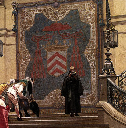 話題を作品に戻しましょう。「灰色の枢機卿」に描かれているタペストリーの紋章の件ですが、持ち主がリシュリューであることは言うまでもありません。リシュリューという実質的な最高権力者の威光を後ろ盾にして自らの政治を強引に押し進めるトランブレーの本性を、ジェロームは紋章と人物の立ち位置によって明確に表現したわけです。またうやうやしく挨拶したり侮蔑の視線を投げかける人々は身なりこそ立派ですが、実際は粗末な修道服に身を包んだ坊主をうらやみ妬んでいたことを皮肉っているのです。