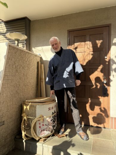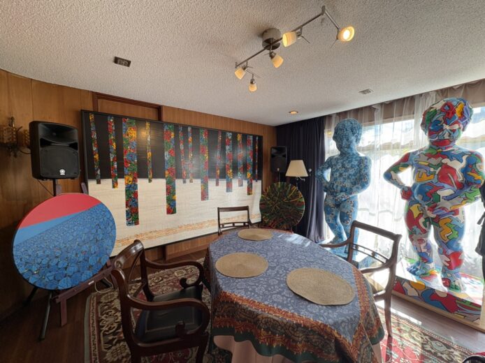 出迎えてくれたパトリック氏は、日本の着物を軽やかに纏い、優しい笑顔を浮かべていた。玄関を開けた途端、壁面から天井まで大小の作品が溢れ、家全体が美術館そのものの趣を放っている。